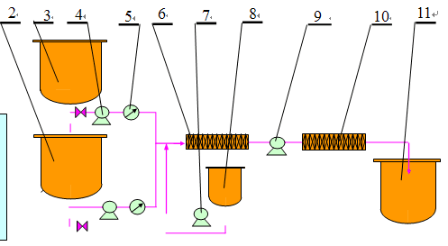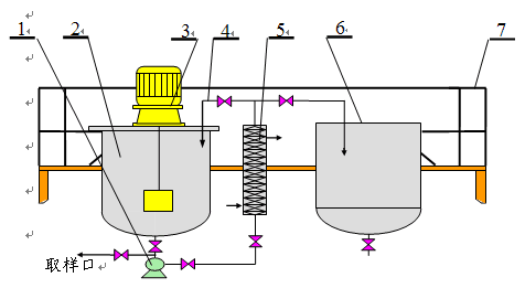 間歇式乳化裝置如下圖所示,整個系統(tǒng)由高剪切乳化泵、平蓋反應(yīng)釜、高剪切乳化機(jī)、輸送泵、流量計、靜態(tài)混合器、成品罐等組成。